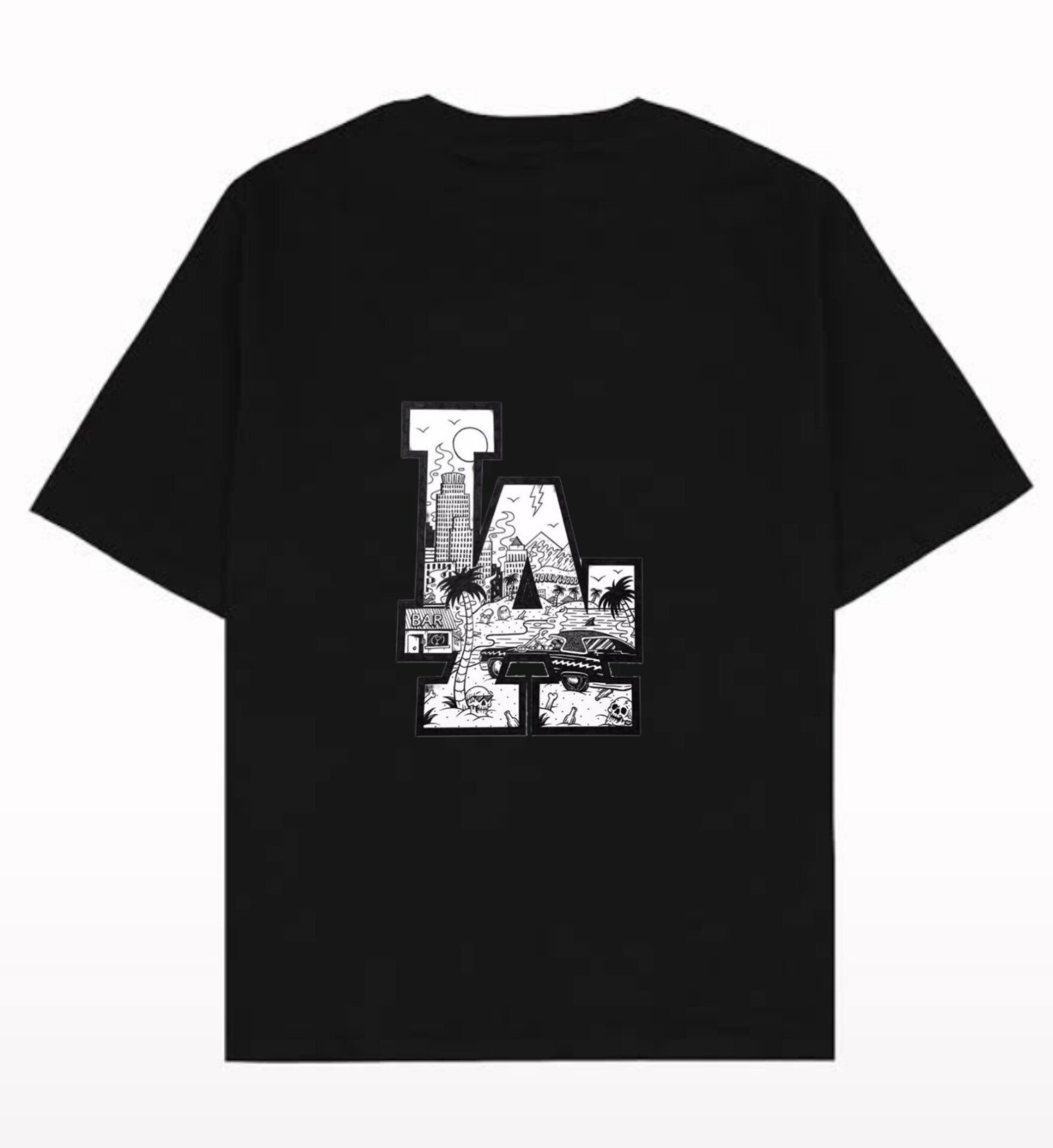 This is a black t-shirt featuring a bold "LA" graphic at the center. Inside the large "LA" letters, there's a detailed black-and-white illustration capturing classic Los Angeles vibes — including skyscrapers, palm trees, beaches, cars, and mountains. The design feels urban and artistic, blending city life with street culture in a bold, eye-catching way. The monochrome artwork gives it a clean but edgy feel, perfect for a streetwear or casual look.