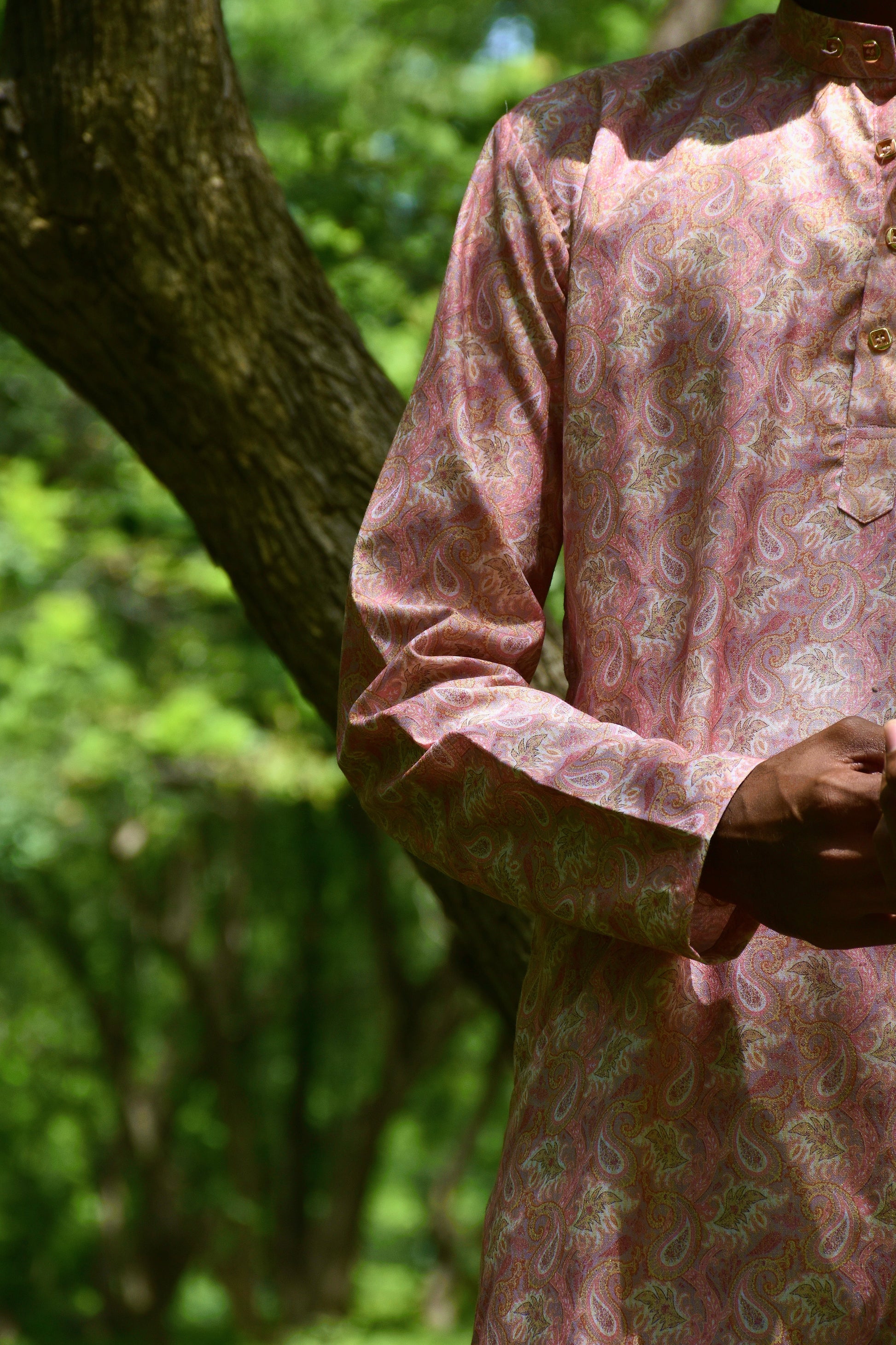 Draped in a soothing peach hue and adorned with intricate paisley motifs, this kurta is a perfect blend of timeless heritage and contemporary charm. The luxurious cotton-silk blend ensures comfort and grace, whether you’re attending a wedding, festive gathering, or capturing that golden-hour moment.