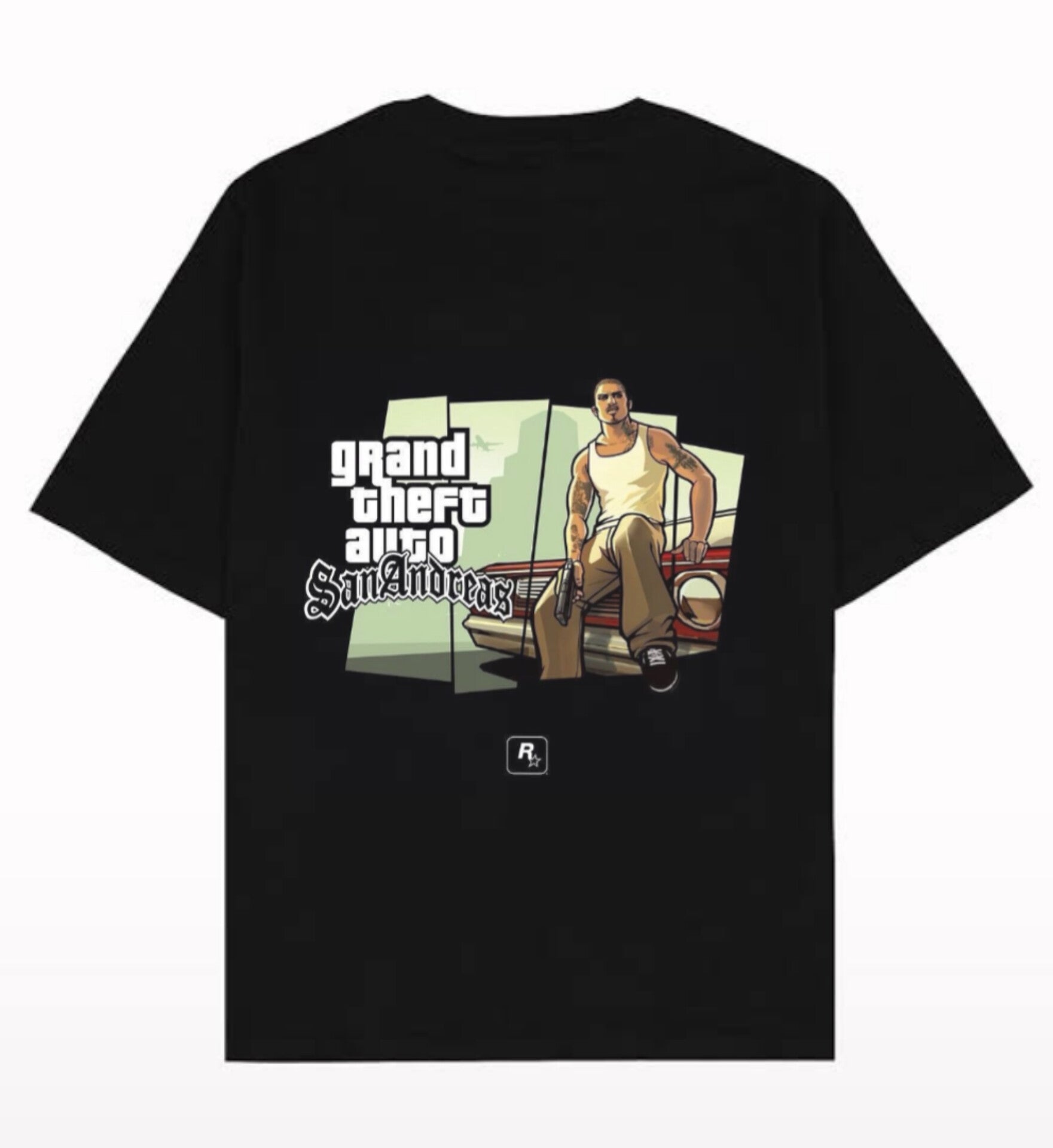 This black t-shirt features an iconic design from the legendary video game Grand Theft Auto: San Andreas. Centered on the back is a bold, graphic-style illustration of CJ (the game's main character) casually leaning on a car while holding a gun, symbolizing the gritty and rebellious spirit of the game. The famous Grand Theft Auto: San Andreas logo is prominently displayed beside him, with the Rockstar Games emblem placed below, completing the classic, nostalgic look. Perfect for gamers and fans of street culture who want to rep one of the greatest games of all time.
