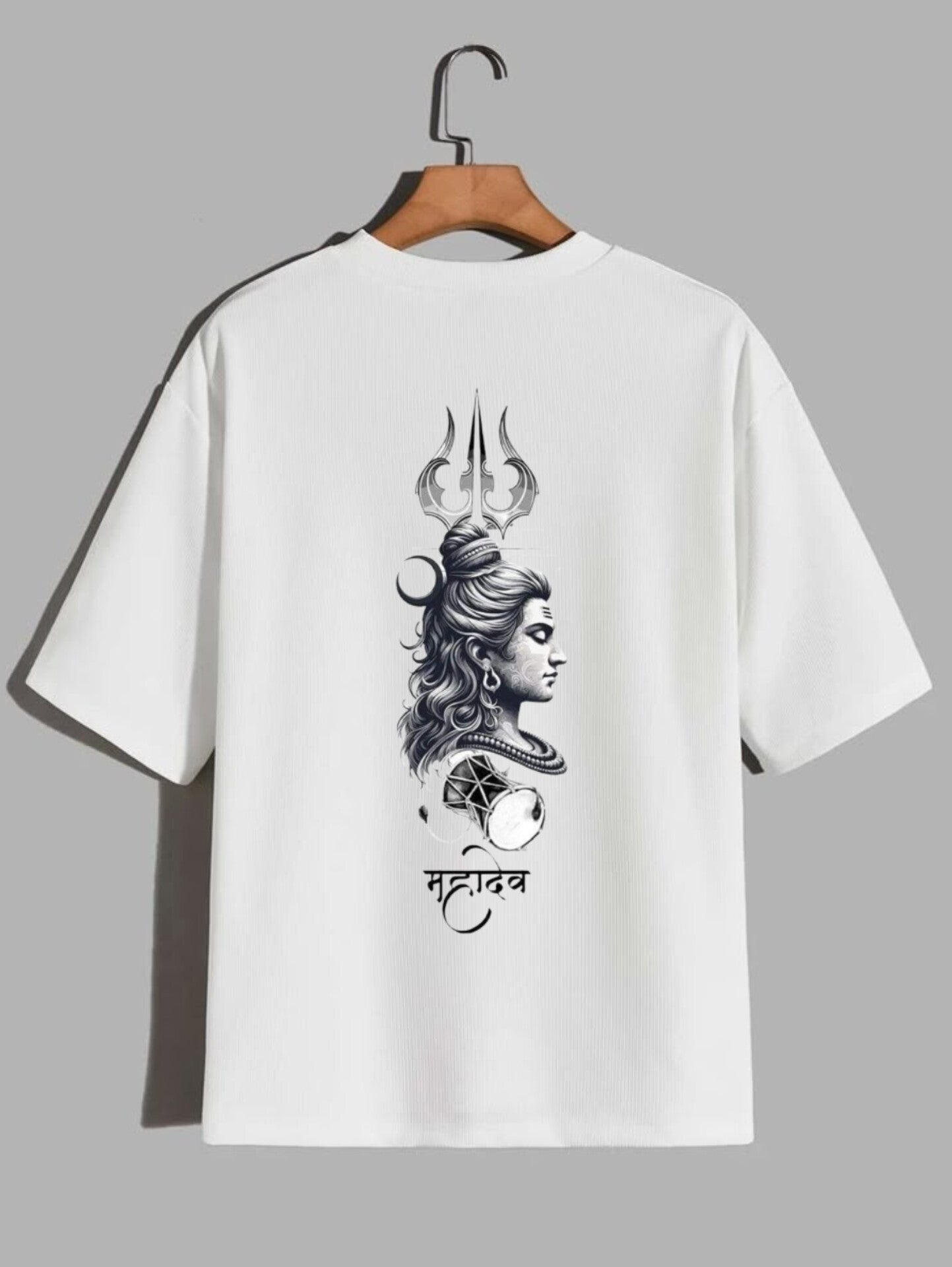 This white t-shirt features a powerful and serene illustration of Lord Shiva, blending divinity with modern design. The artwork showcases Shiva's profile with detailed flowing hair, a crescent moon, Rudraksha beads, and the sacred damru (drum), symbolizing rhythm and creation. Above his head rises the iconic Trishul (trident), representing destruction of evil and spiritual awakening. Below the image, the word "महादेव" (Mahadev) is written in graceful Devanagari script, reinforcing the aura of reverence and strength. Perfect for those who resonate with inner power, mindfulness, and devotion.